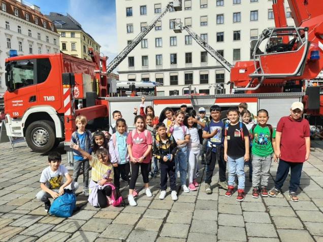 1.) Feuerwehrfest: Gleich in der ersten Schulwoche besuchten wir das Feuerwehrfest „Am Hof“. Wir durften uns in ein Feuerwehrauto hineinsetzen und erlebten eine interessante Feuerlösch-Show.
