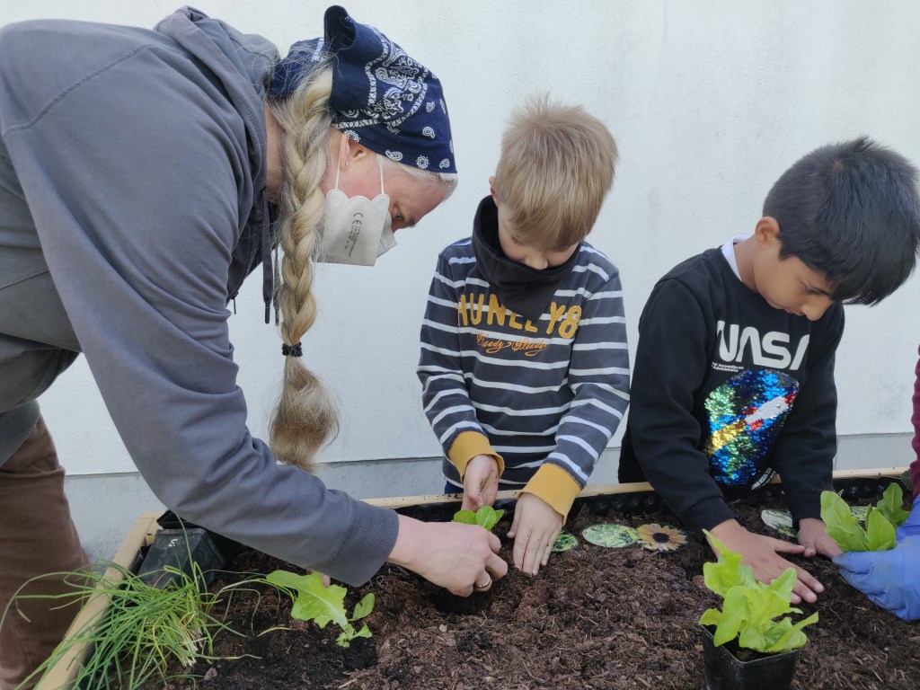 Neben Pflücksalat, Erdbeeren und Schnittlauch durften die Kinder auch die Samen von Karotte, Radieschen und Kapuzinerkresse einsetzen. Vorsichtig drückten die Kinder die winzig kleinen Samen in die Erde und erfuhren dabei interessiert, woraus Erde überhaupt besteht und wie viel Platz man zwischen den einzelnen Pflanzen lassen muss, damit sie wachsen und gedeihen können.