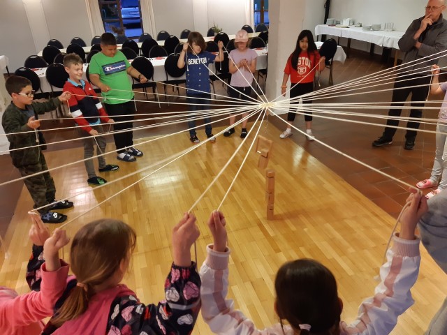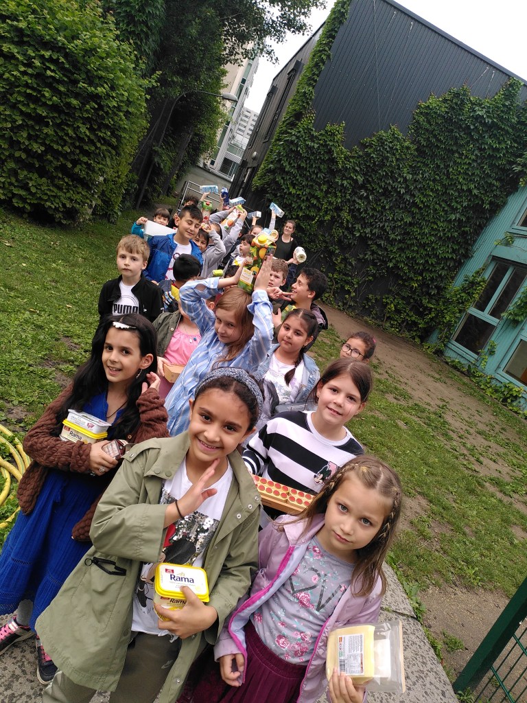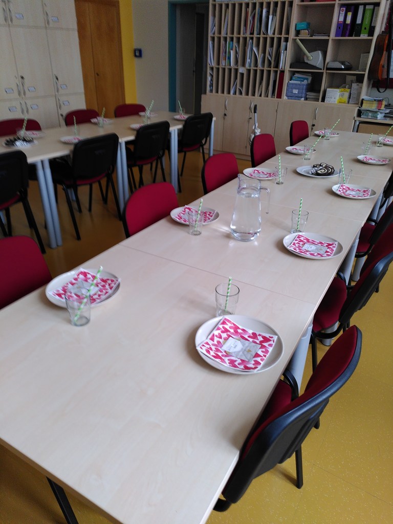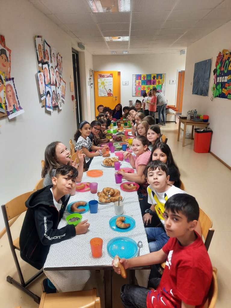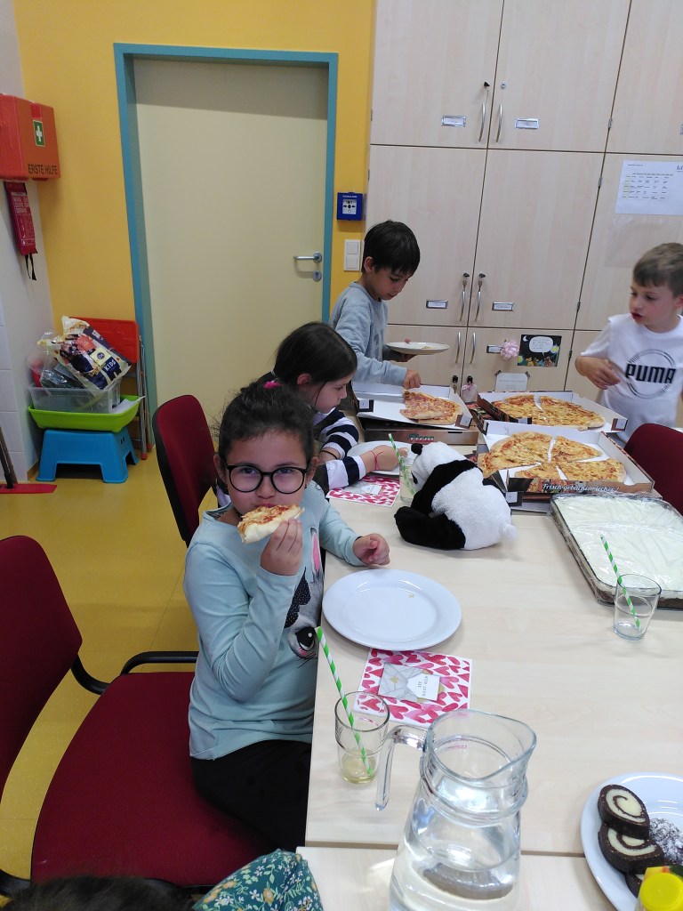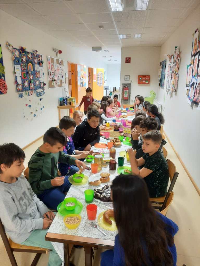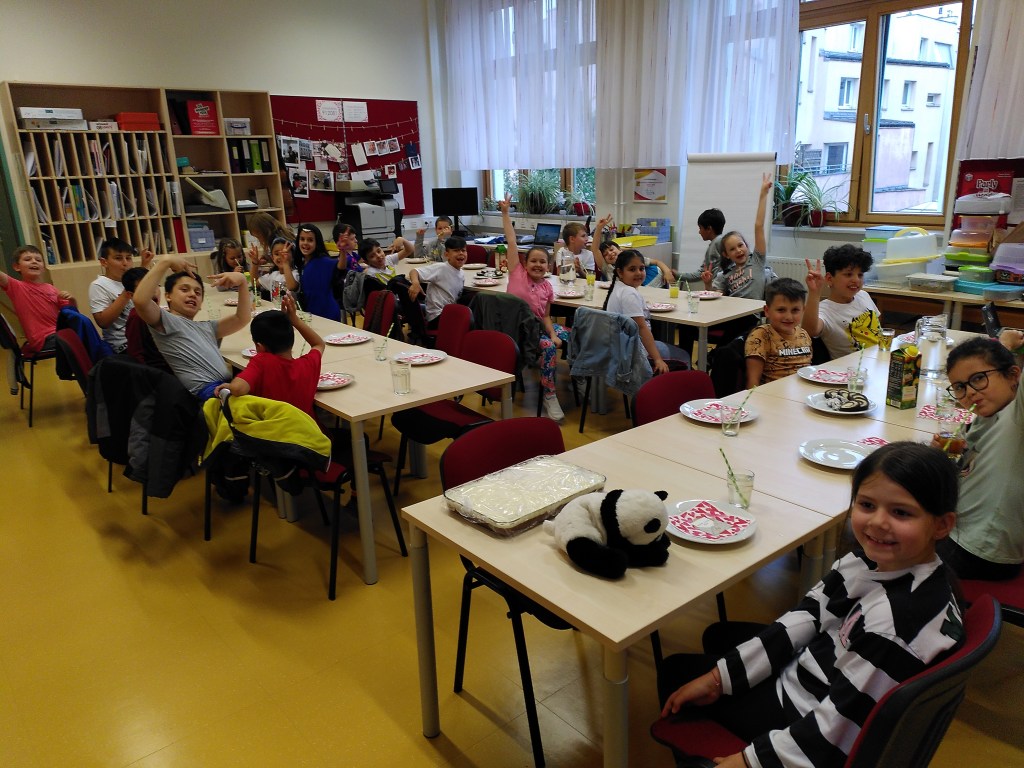 Das Frühstück verspeisten wir gemeinsam an einer langen Tafel vor unserer Klasse. Es gab viele leckere Sachen! Nach dem Aufräumen machten wir noch kurz Mathematik und danach gab es ein Patschenkino.