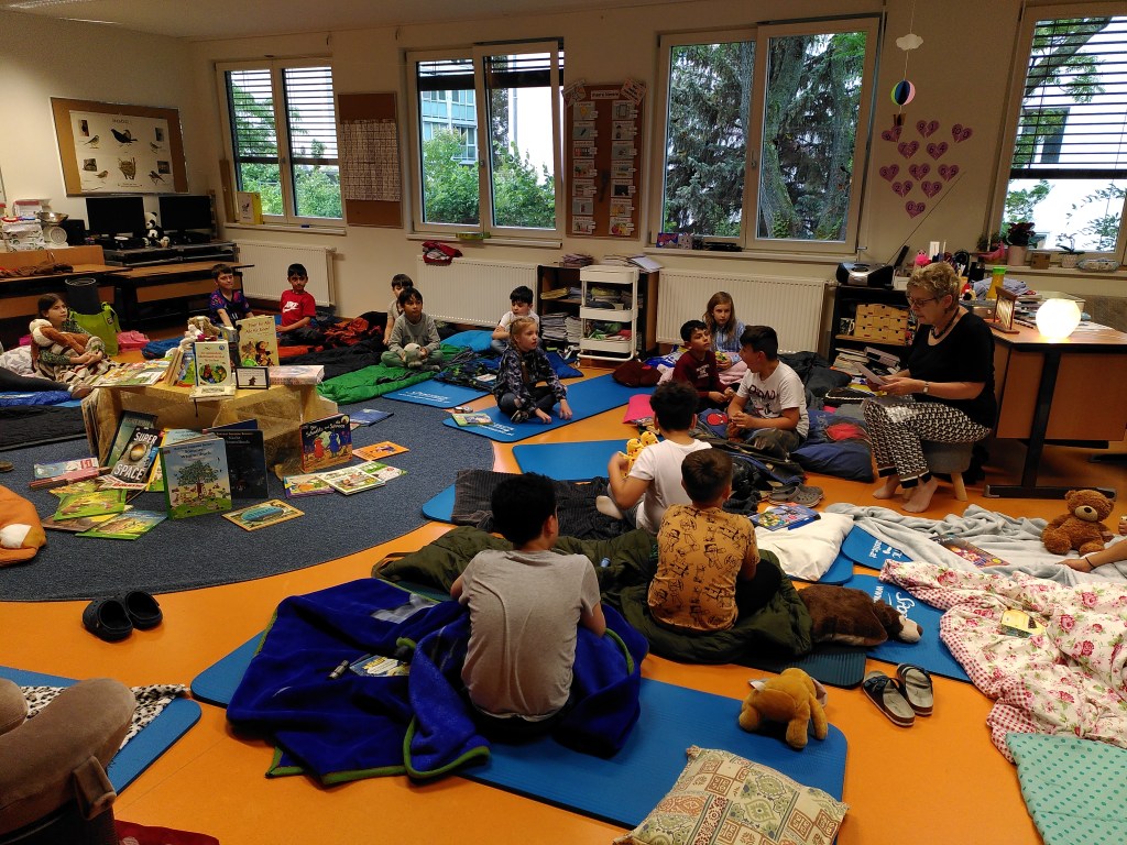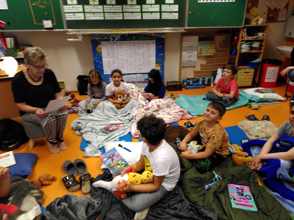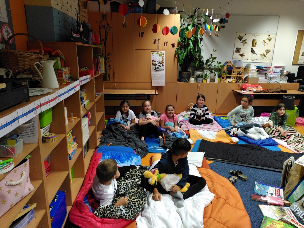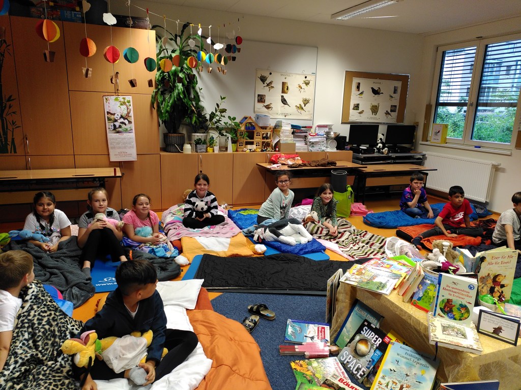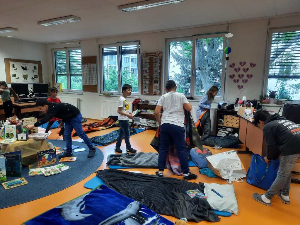 Voller Vorfreude trafen wir uns am Abend mit unseren Lehrerinnen Susie und Christine in unserer bereits ausgeräumten Klasse. Wir hatten jede Menge Gepäck dabei und richteten uns unsere Schlafplätze her. Nach getaner Arbeit gab es im Lehrerzimmer Pizza, Lesenachtlimonade und Kuchen.