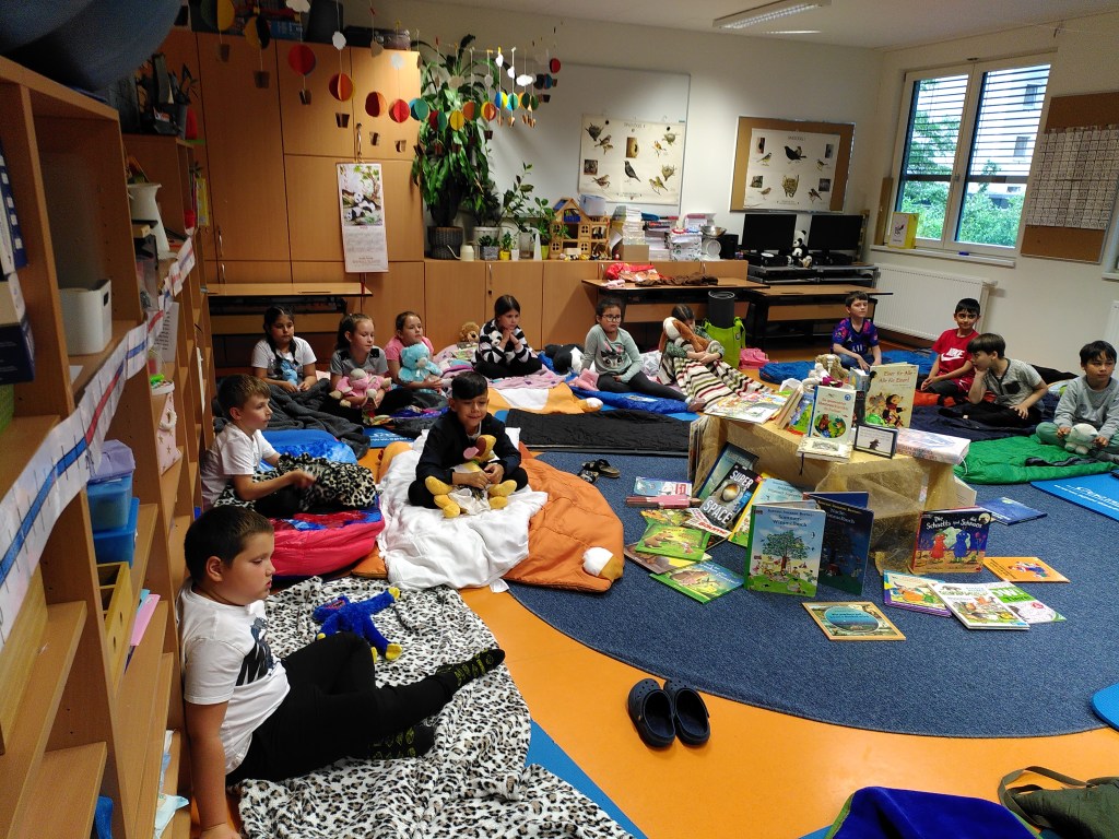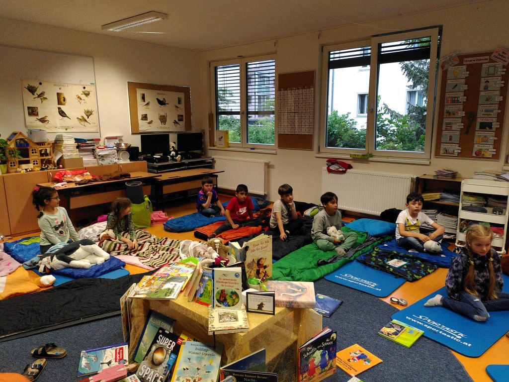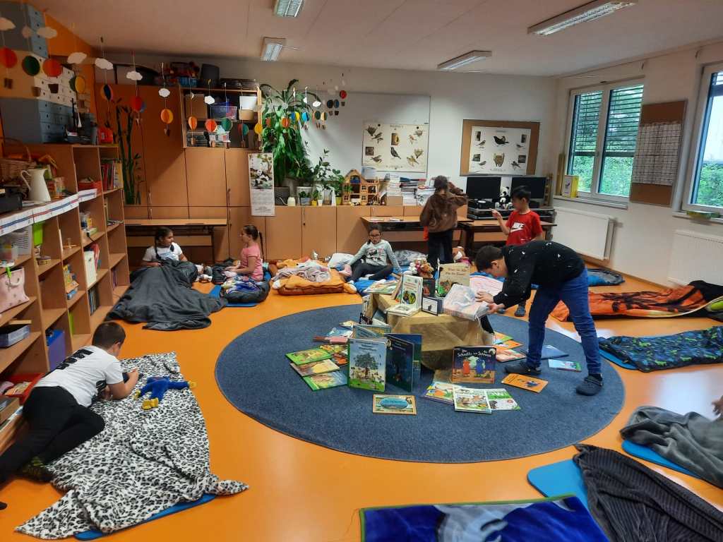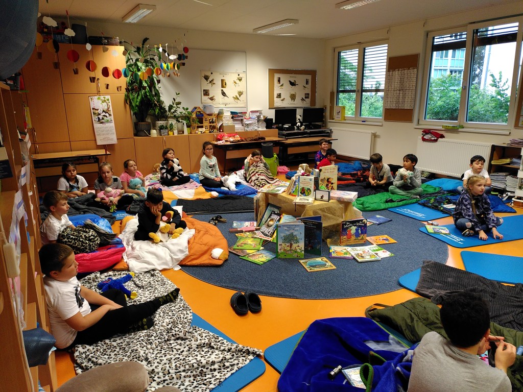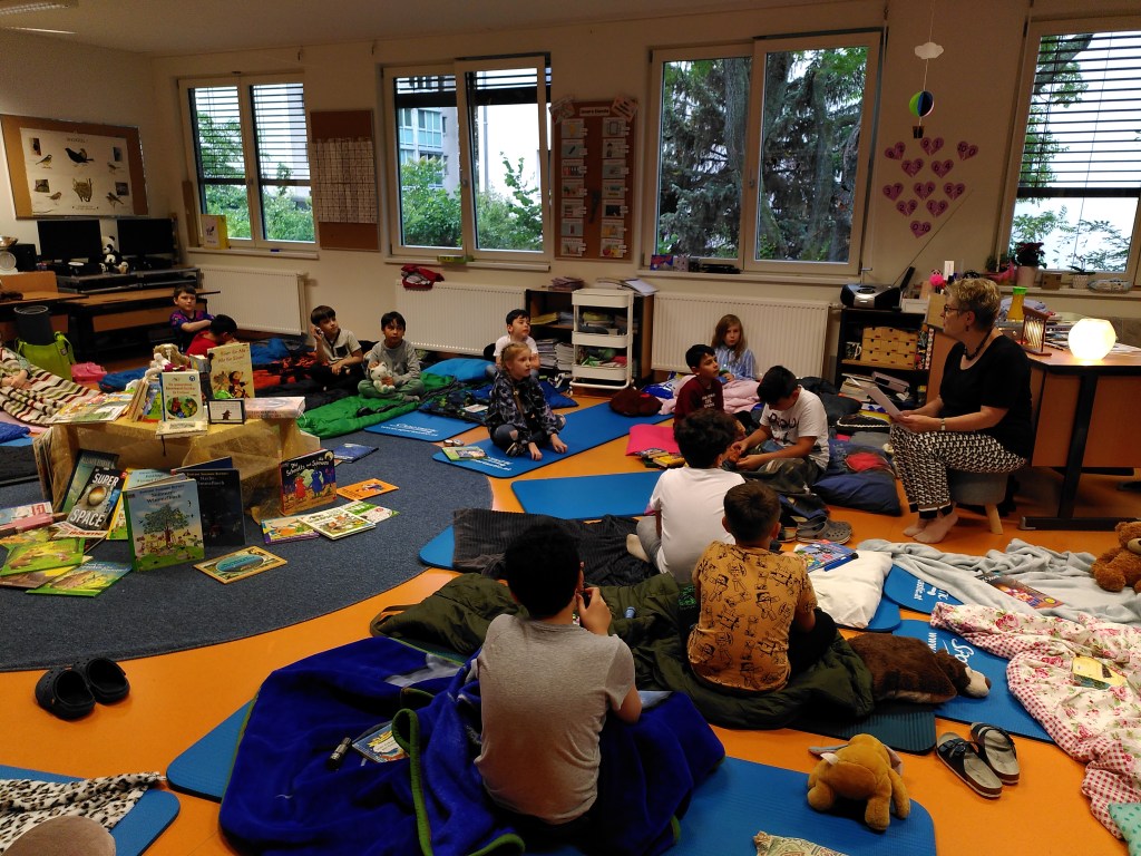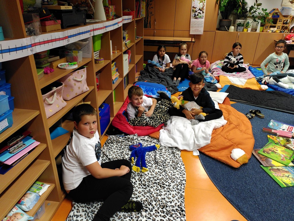 Voller Vorfreude trafen wir uns am Abend mit unseren Lehrerinnen Susie und Christine in unserer bereits ausgeräumten Klasse. Wir hatten jede Menge Gepäck dabei und richteten uns unsere Schlafplätze her. Nach getaner Arbeit gab es im Lehrerzimmer Pizza, Lesenachtlimonade und Kuchen.