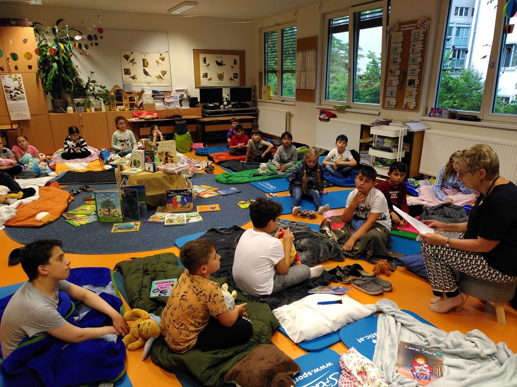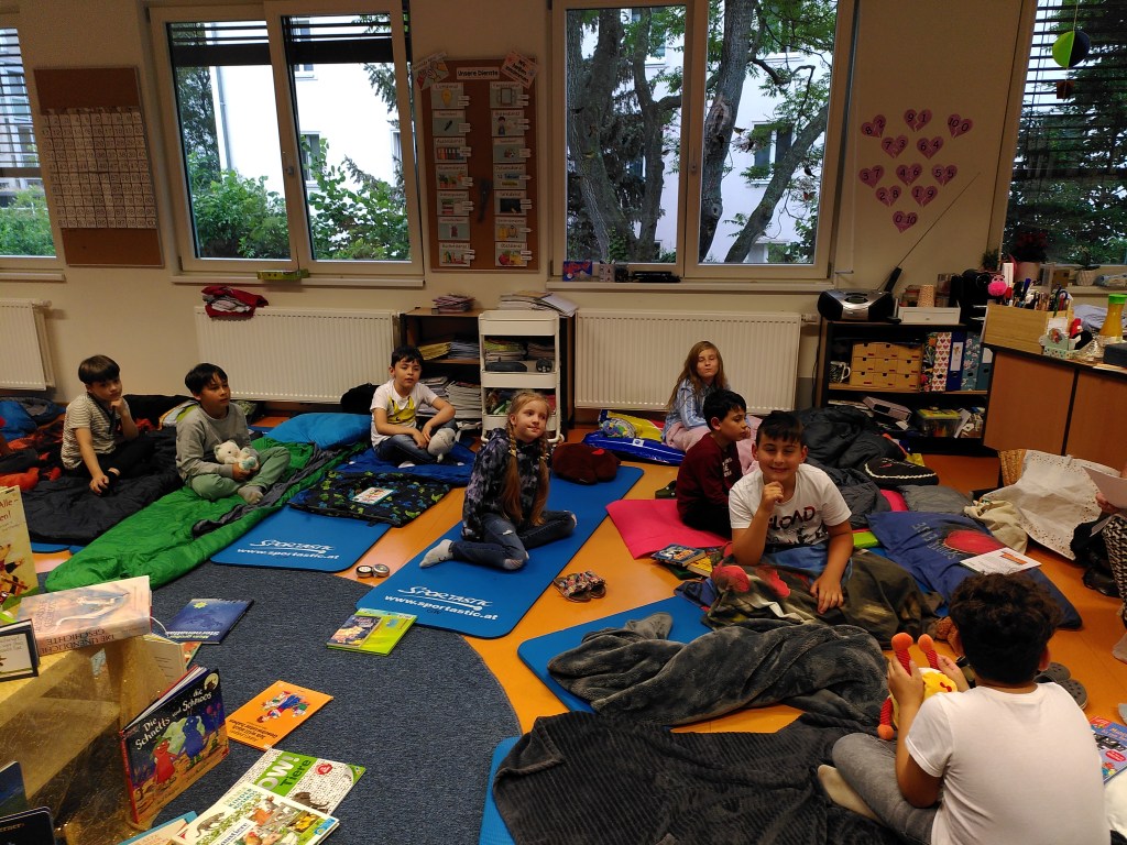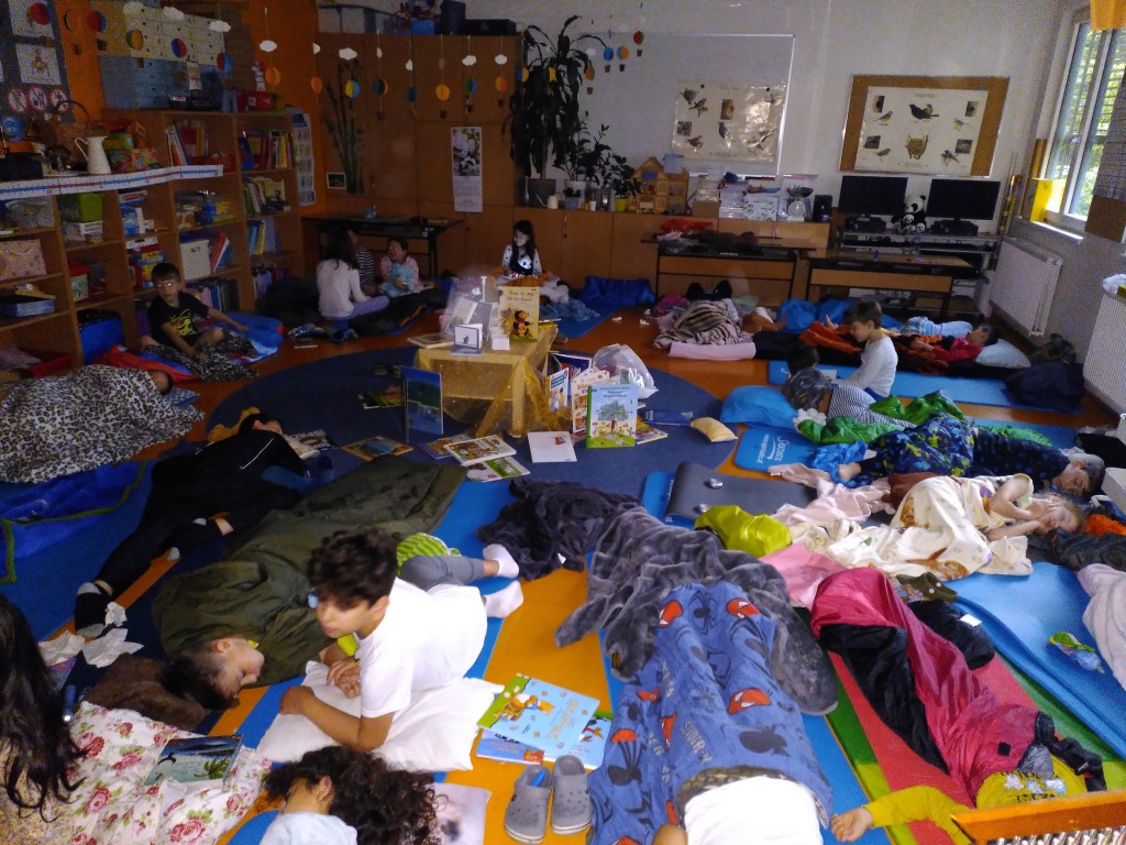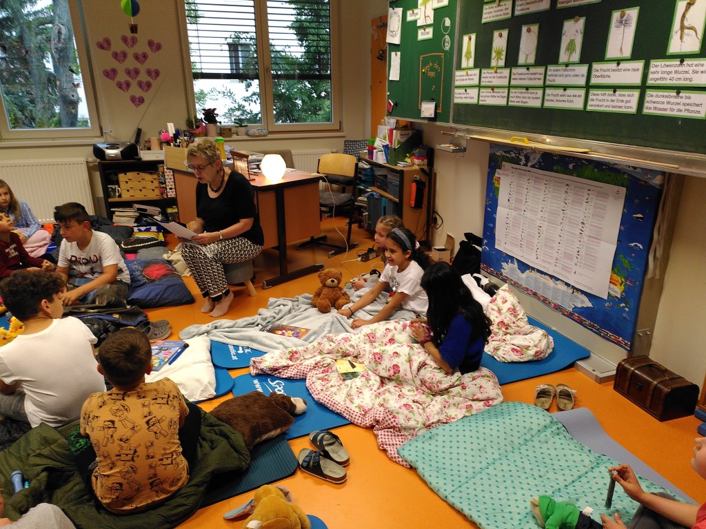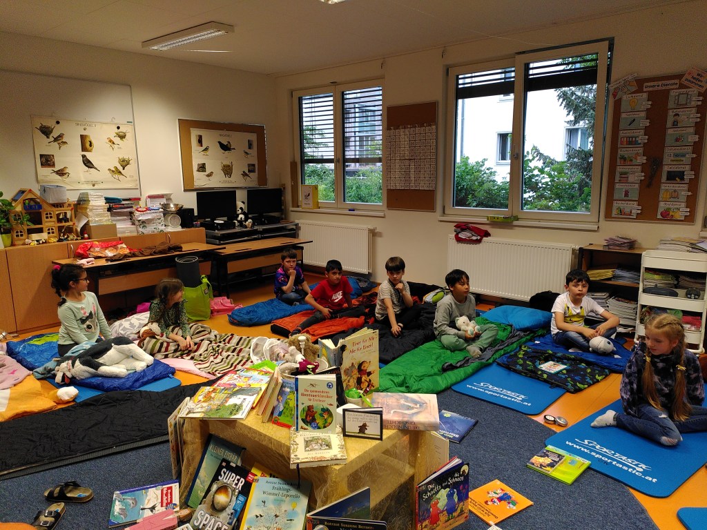 Voller Vorfreude trafen wir uns am Abend mit unseren Lehrerinnen Susie und Christine in unserer bereits ausgeräumten Klasse. Wir hatten jede Menge Gepäck dabei und richteten uns unsere Schlafplätze her. Nach getaner Arbeit gab es im Lehrerzimmer Pizza, Lesenachtlimonade und Kuchen.