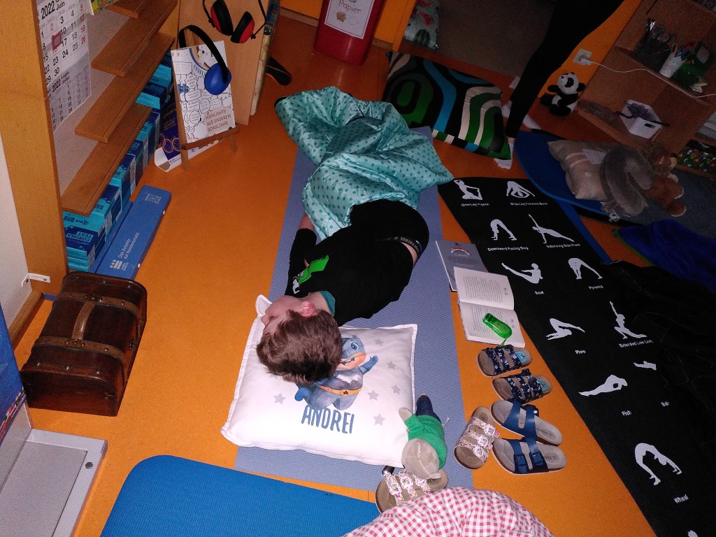 Das anschließende Pyjamaanziehen und Zähneputzen erledigten wir schnell und dann konnten wir gemütlich in unseren Büchern lesen. Vor dem Schlafengehen erfuhren wir noch, wie es in unserer Vorlesegeschichte „Die kleine Hexe“ weiterging.
