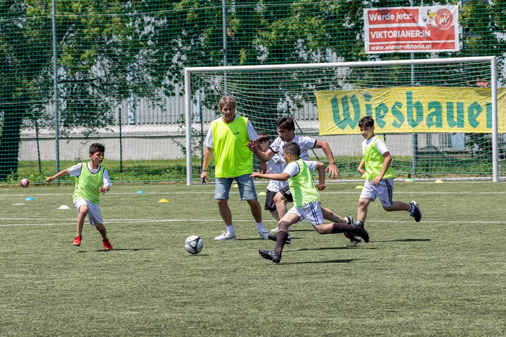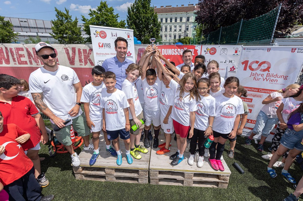 Am 15. Juni wurde mit einem rauschenden Sportfest am Fußballplatz der Wiener Viktoria das „Bildungsgrätzl zwölf“ feierlich eröffnet. Neben zahlreichen Stationen, die die Kinder aus den teilnehmenden Schulen nach Lust und Laune ausprobieren durften, fand auch ein Fußballturnier statt, auf das sich einige unserer Schüler:innen der dritten und vierten Klassen gemeinsam mit den Trainer:innen Linda Ellerich und Harald Hofstetter wochenlang vorbereitet hatten. Als Gruppensieger der Vorrunde musste sich das Team der Rothenburgschule vor den Augen von Bildungsstadtrat Christoph Wiederkehr und Bezirksvorsteher Wilfried Zankl erst im Finale der Mannschaft der Johann-Hoffmann-Mittelschule geschlagen geben und eroberte Platz zwei.