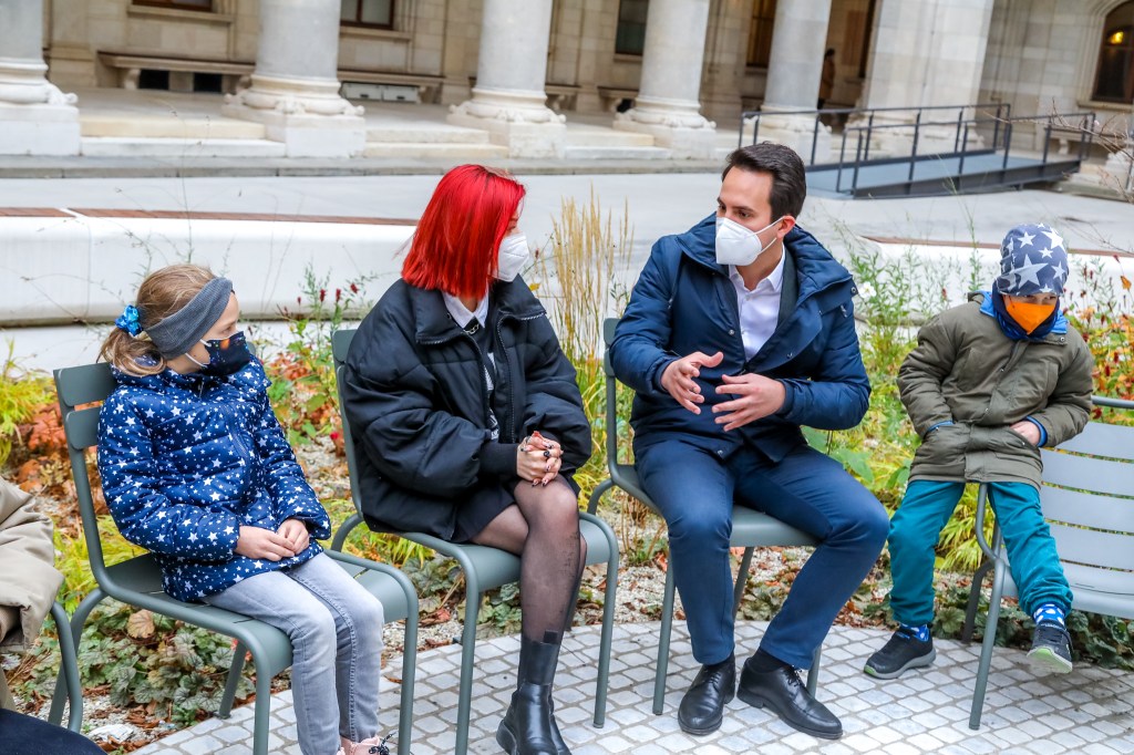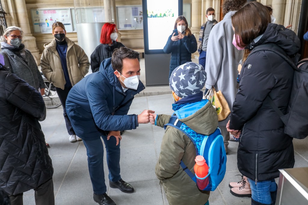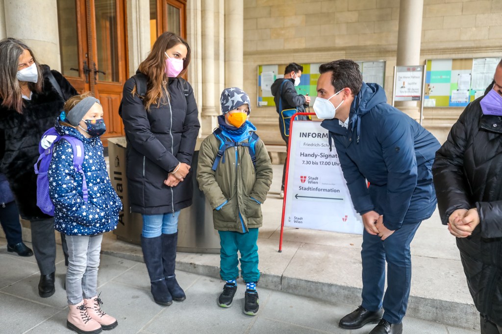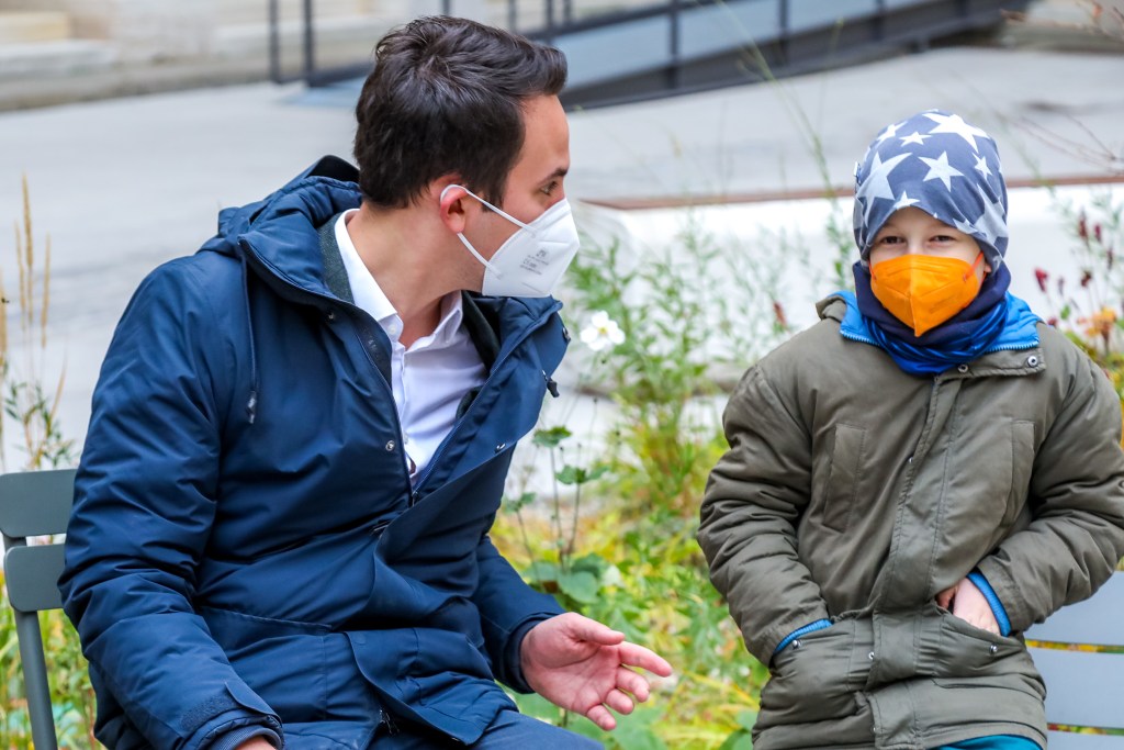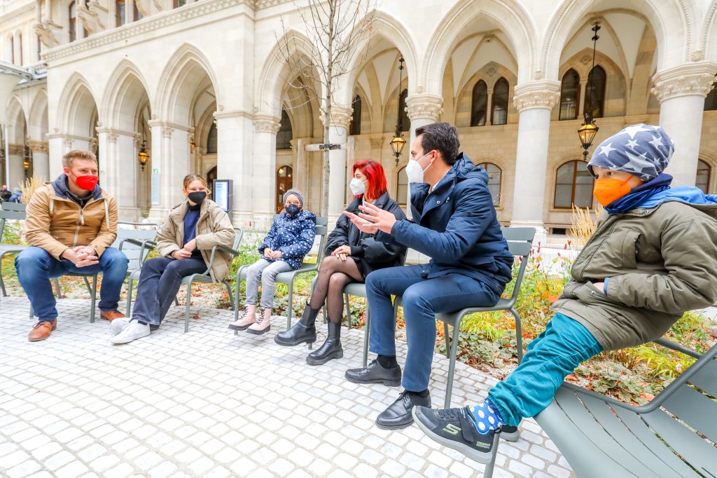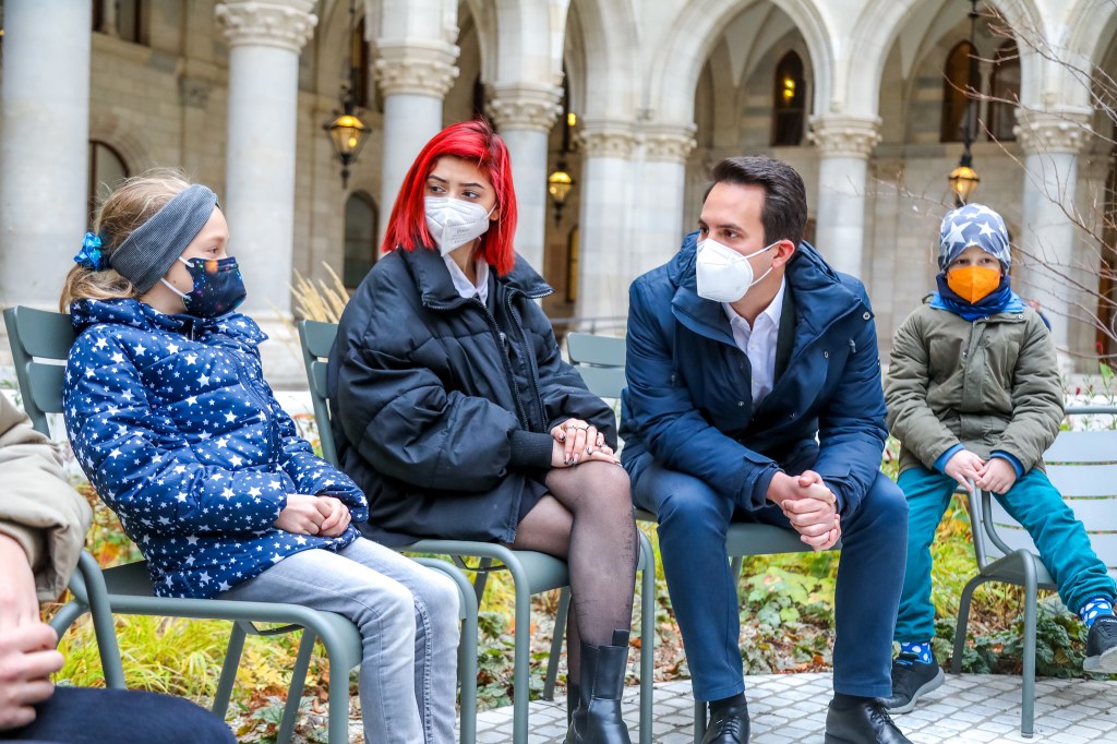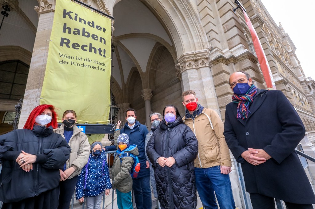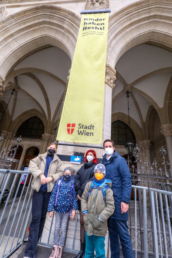 Anlässlich des Tages der Kinderrechte am 20. November durften zwei tüchtige Kinder der 3c als zwei von nur 4! SchülerInnen aus ganz Wien am Freitag davor ins Rathaus fahren. Nachdem gemeinsam mit einigen Politikern aus dem Bildungsbereich die Kinderrechte-Fahne gehisst wurde, nahmen sich Vizebürgermeister Christoph Wiederkehr und der Wiener Landtagsabgeordnete Marcus Gremel noch Zeit, um sich im Anschluss daran mit ihnen über Kinderrechte auszutauschen. Diskutiert wurde aus gegebenem Anlass unter anderem auch das Recht auf Bildung. Die Schule als Lernort kann durch nichts ersetzt werden – da sind wir uns alle einig!